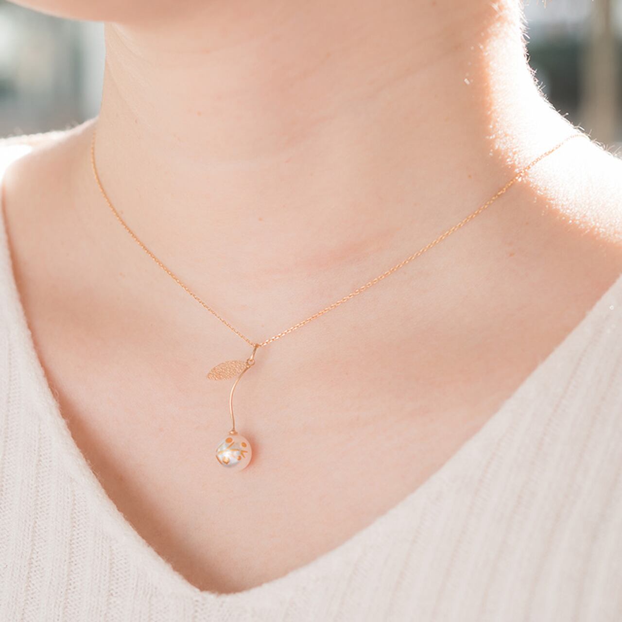 18金の輝きと、蒔絵の技法が美しく表現されたPEARL NECKLACE Olive。鮮やかなオリーブ柄の蒔絵が、大粒の真珠と融合し、独特の存在感を放ちます。